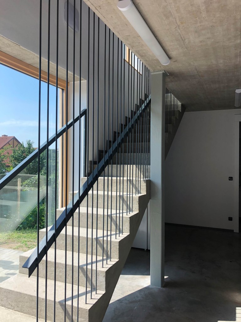 Interiér je řešen spíše stroze a je jasně funkčně rozdělen na garáž a denní místnost se zázemím. Hlavními materiály jsou beton, kov, pálená taška a dřevo, které stavbu zjemňuje vevnitř i venku.