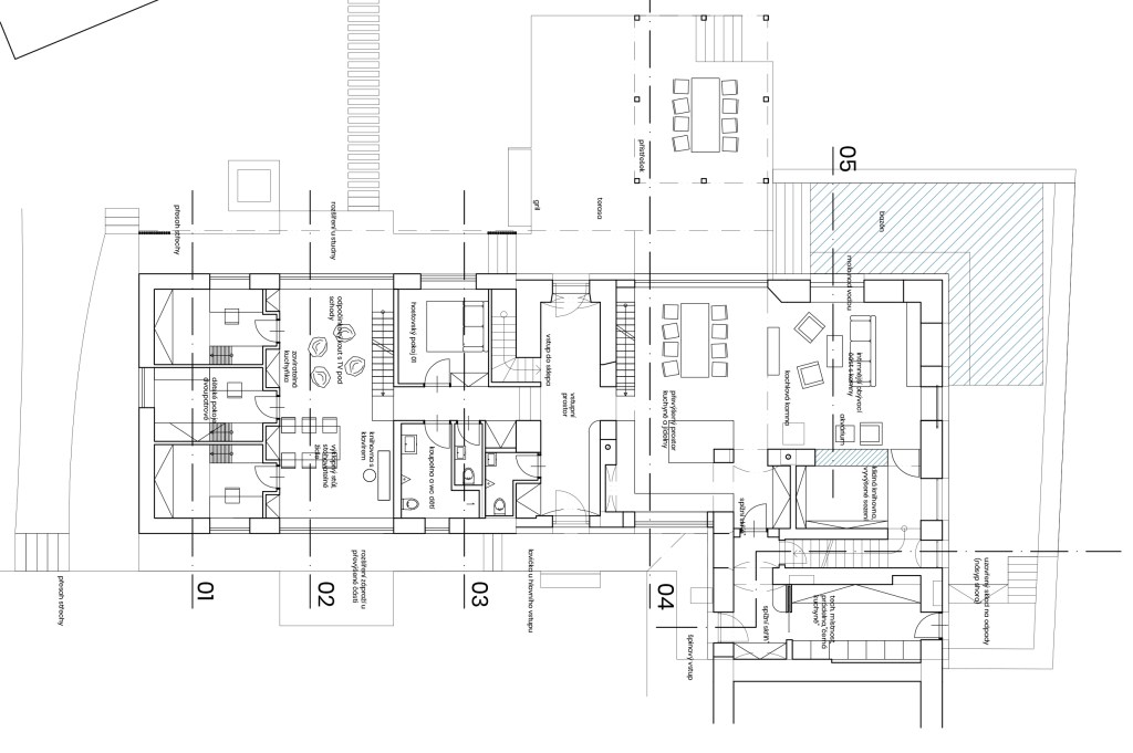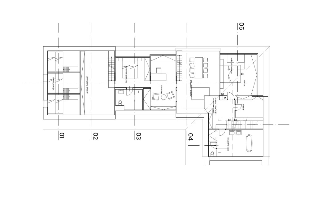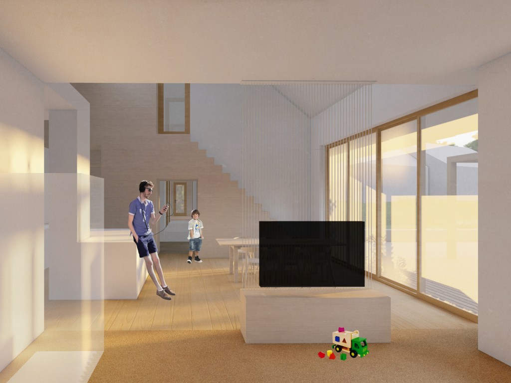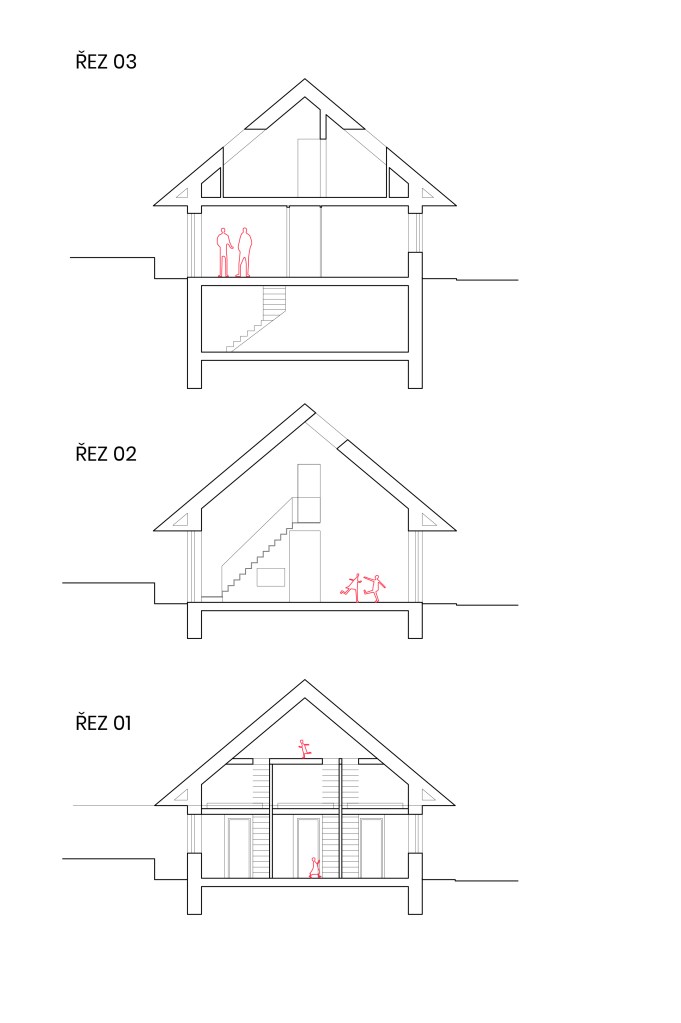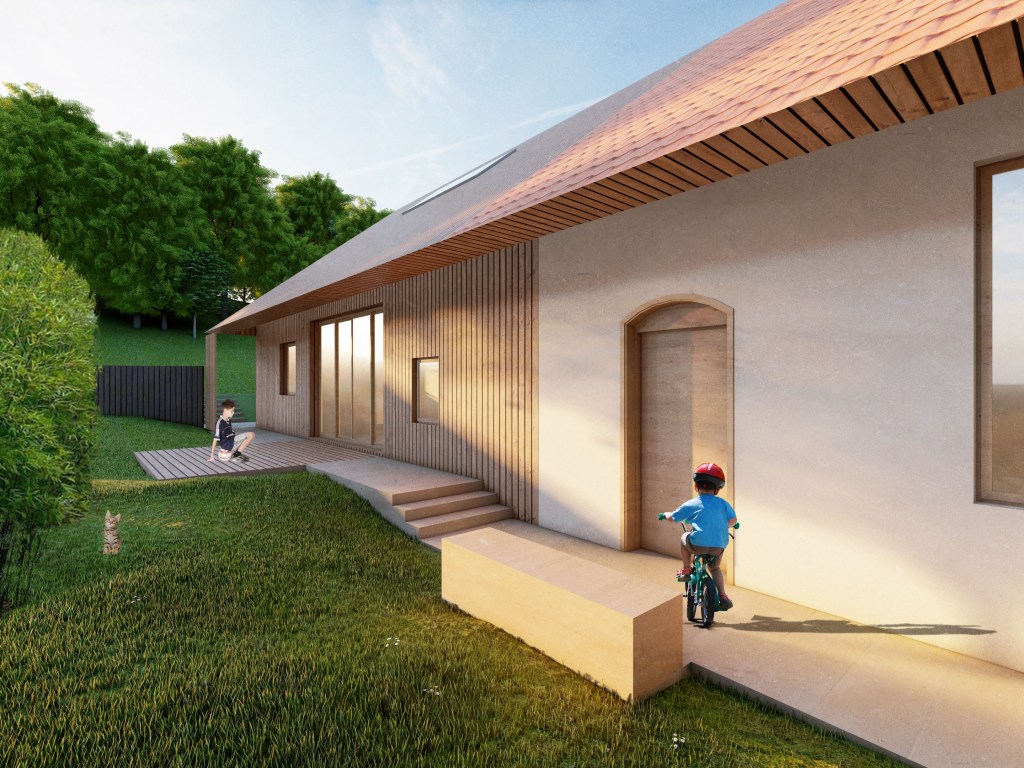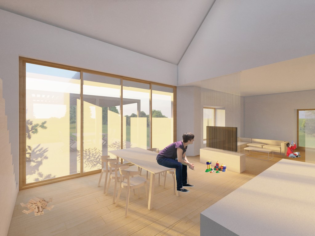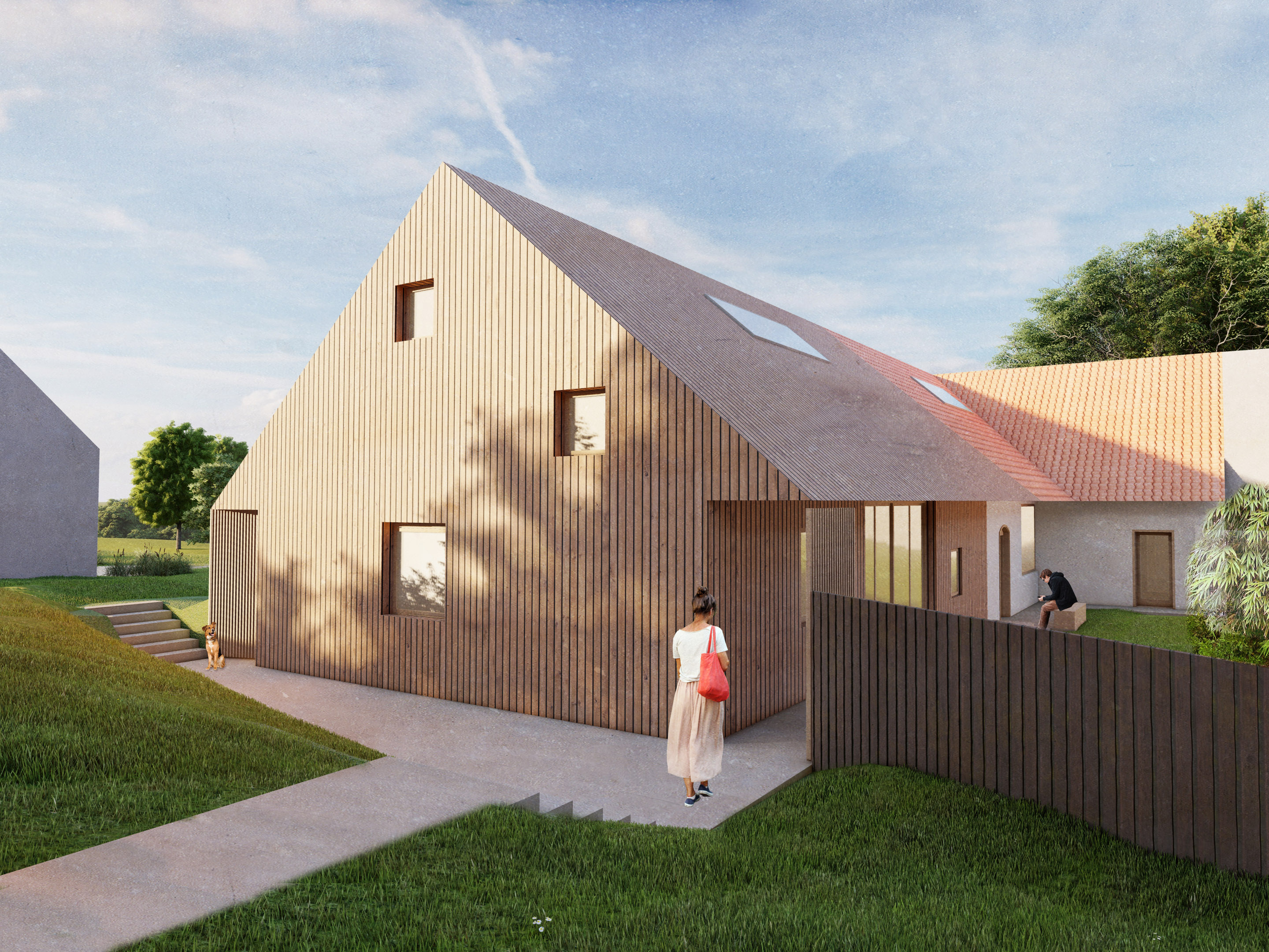 Rodinný dům je navržen jako částečná rekonstrukce původního stavení. Pozemek je svažitý se severní orientací a je stíněn lesem. Jeho hodnotou je klid a velká zahrada na západ od domu. Dům je rozdělen na „starou a novou“ část. Stará má tlusté kamenné zdi, a je zde pomocí bílé omítky, dřevěné podlahy, nebo pálené krytiny podtržen historický charakter. Nová část je navržena z dřevěných panelů, které jsou pohledové v interiéru a dřevo se propisuje také na fasádu a na střechu části. Každá z částí má svůj převýšený prostor do krovu. Ve staré je to společenská část – jídelna s kuchyní v návaznosti na obývací pokoj a v nové se jedná o společnou hernu a pracovnu dětí. Tyto převýšené části jsou maximálně propojeny se zahradou velkými prosklenými plochami.