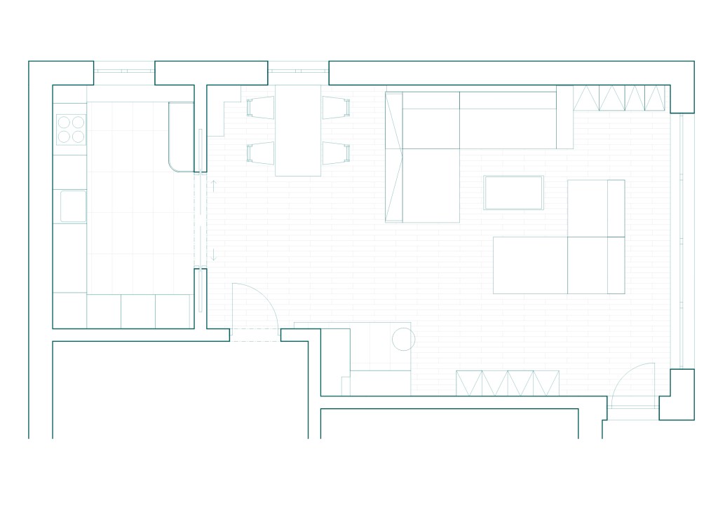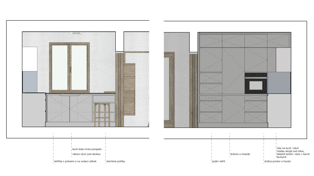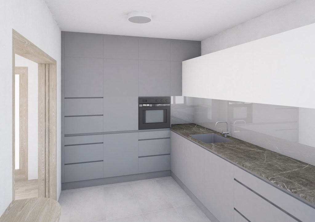Nejvýraznějším prvkem kuchyňské linky je kamenná pracovní deska z tmavého kvarcitu, která vytváří kontrast se zbytkem nábytku. Na vysoké a spodní skříňky je použita jemná a matná šedá barva, horní jsou bílé. Vysokou část nejdále od okna tvoří lednice, spíž a trouba spolu s dalším úložným prostorem. Pracovní deska probíhá až pod okno kde je rozšířena o parapet. Dřevěný pultík s kulatým rohem vnáší prvek dřeva, který je zopakován z obývacího pokoje.