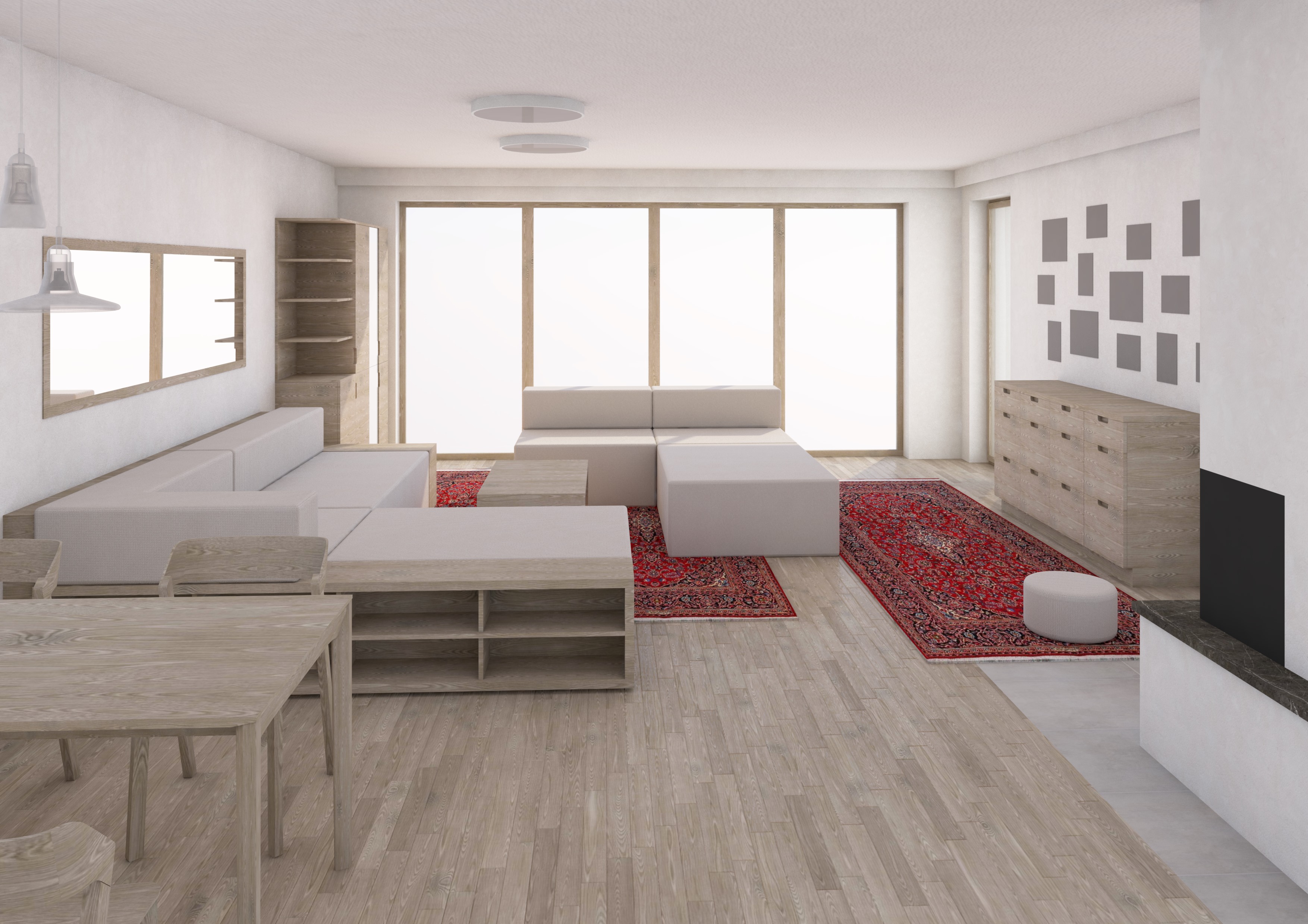Studie interiéru RD v Moravanech řeší obývací pokoj a kuchyni domu. V obývacím pokoji je důraz kladen na posezení na pohovkách u krbu. Toto místo vytváří srdce domu. Můžete si vybrat kam se posadíte podle denní doby a nálady – s výhledem do zahrady, blízko krbu nebo s pohledem na celý interiér. Pohovka je modulová a doplňovaná nábytkovými díly. Prostor zútulňují mimo dřevěné podlahy a nábytku zejména turecké koberce, které dají místu osobitý charakter.